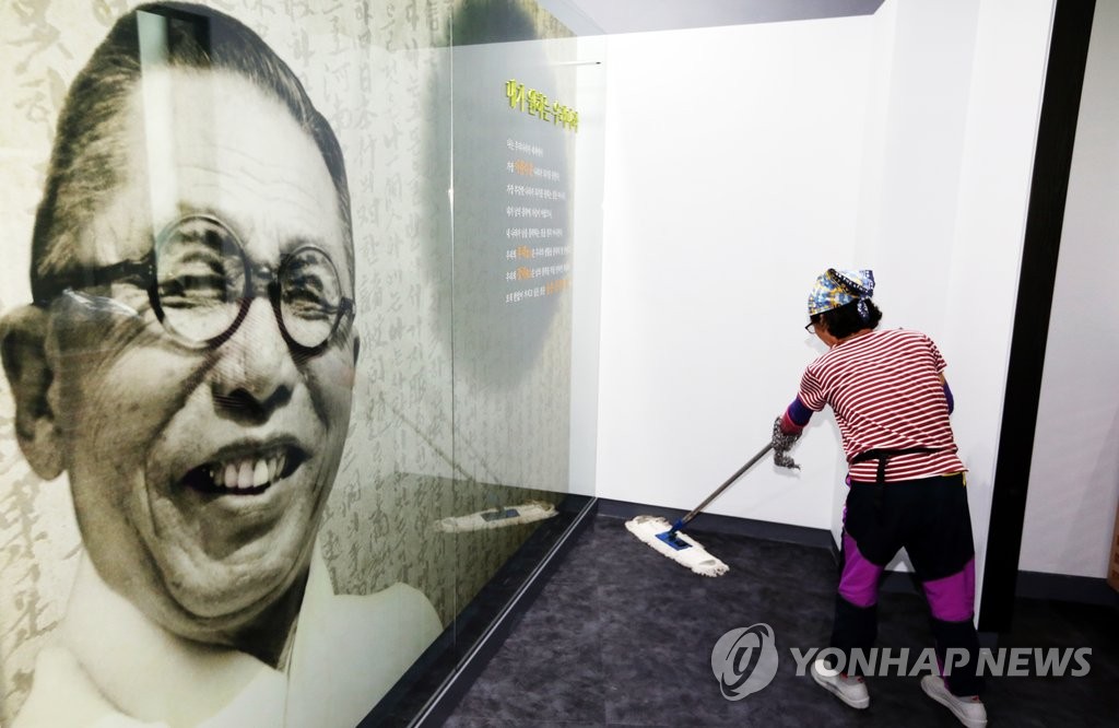 (광주=연합뉴스) 박철홍 기자 = 광복 70주년을 하루 앞둔 14일 오전 광주 동구 학2동 백화마을 내에 자리잡은 광주백범기념관이 9월 개관을 앞두고 모습을 드러냈다. 사진은 기념관 입구에 전시된 백범 김구 선생의 모습. 2015.8.14 pch80@yna.co.kr