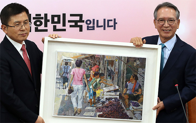 “박지오라고 그림 그리는 내 친구가 있는데… 부산 내 지역구(영도)에 좀 어려운 사람들이 많다. 그래서 늘 보면서 생각하려고 서민 냄새가 나는, 시장 풍경 같은 거 하나 그려 달라고 해 받은 거다. 과일 장사 아주머니가 아이들에게 포도를 주는 모습인데…. 자신도 넉넉하지 않지만 베푸는 마음이 그림에서 묻어나 내가 참 좋아한다. 정치권이 그런 마음을 가졌으면 해서 선물했다.” (황 대표는 그 마음이 있던가.) “아직까지는 있는지 없는지 잘 모르겠고….” (비싼 그림인가?) “싸지는 않을걸. 그 친구가 무슨 한국화 심사위원장도 오래했는데….”