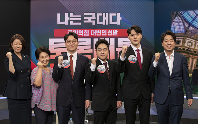 이준석(오른쪽) 대표 등장으로 보수정당 이미지가 바뀌고 있다. 이 대표가 지난 5일 ‘나는 국대다’ 토론 배틀에서 선발된 대변인단 등과 함께 기념촬영을 하고 있다. 사진=연합뉴스