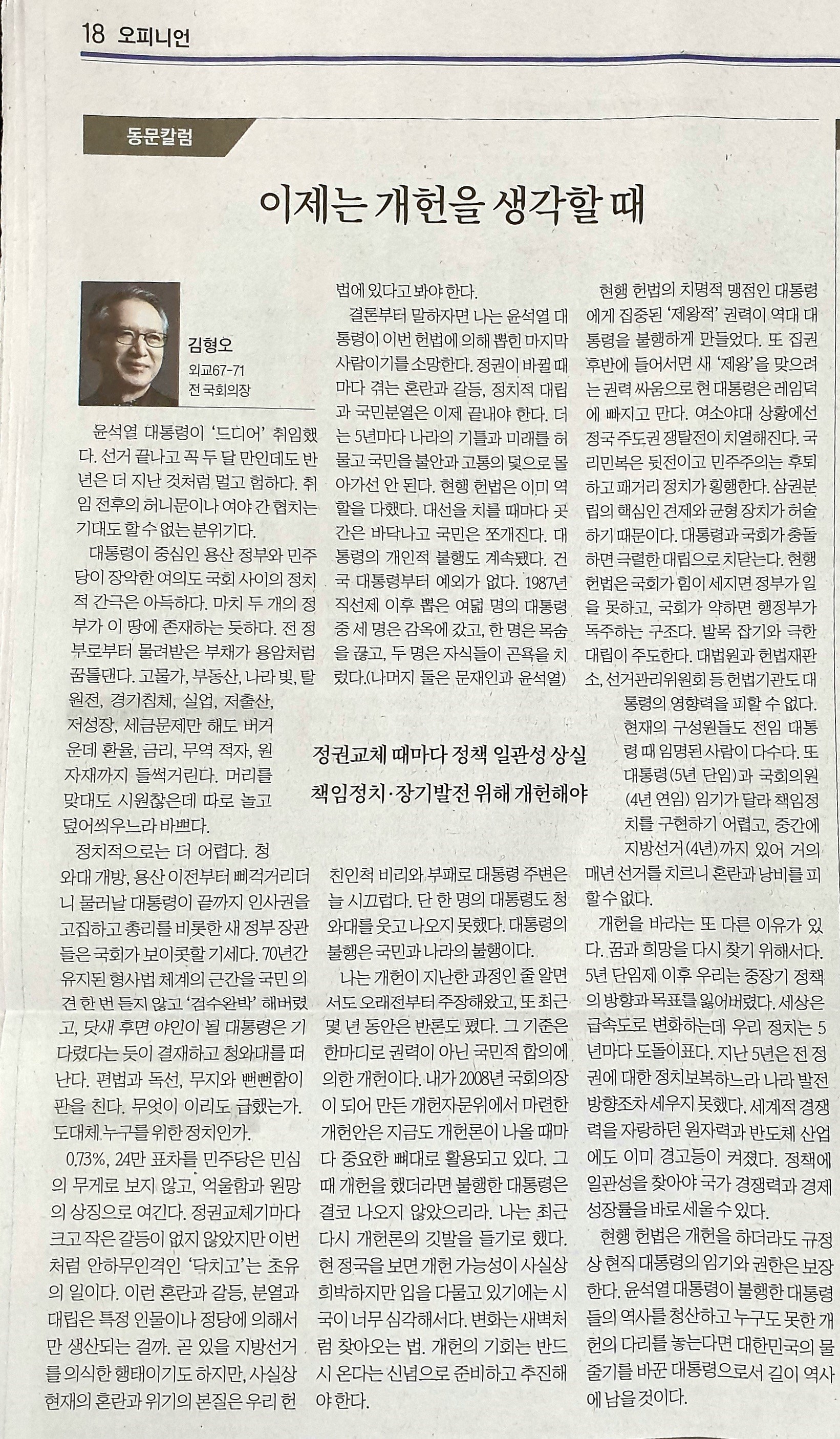 나는 개헌이 지난한 과정인 줄 알면서도 오래전부터 주장해왔고, 또 최근 몇 년 동안은 반론도 폈다. 그 기준은 한마디로 권력이 아닌 국민적 합의에 의한 개헌이다. 내가 2008년 국회의장이 되어 만든 개헌자문위에서 마련한 개헌안은 지금도 개헌론이 나올 때마다 중요한 뼈대로 활용되고 있다. 그때 개헌을 했더라면 불행한 대통령은 결코 나오지 않았으리라. 나는 최근 다시 개헌론의 깃발을 들기로 했다. 현 정국을 보면 개헌 가능성이 사실상 희박하지만 입을 다물고 있기에는 시국이 너무 심각해서다. 변화는 새벽처럼 찾아오는 법. 개헌의 기회는 반드시 온다는 신념으로 준비하고 추진해야 한다.