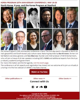 이날 컨퍼런스는 스탠퍼드대 월터 쇼렌스틴 아시아태평양연구소(APARC) ‘코리아 프로그램’ 개설 20주년을 기념해 열렸으며 김형오 전 국회의장이 만찬 축하연설을 했다.