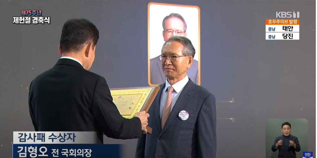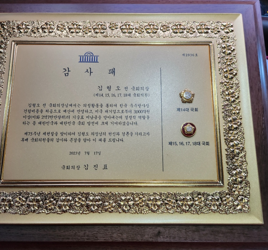 제 75주년 제헌절을 맞이하여 김형오 의장님의 헌신과 경륜을 기리고자 후배 국회의원들의 감사와 존경을 담아 이 패를 드립니다.