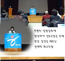 전재희 썸네일형 리스트형 [3.7] 영도구 당원집회 더보기 [오마이TV]문 닫고 회의하면 되잖아요!! 한나라당 사무처 직원들이 4·25 재보선 공천에 반발, 이틀째 총파업에 돌입한 가운데 그 여파가 곳곳에서 감지되고 있다. 6일 오전 8시 30분경 국회 한나라당 대표실에서 점거 농성을 벌이던 사무처 직원 50여명이 원내대표실 앞으로 이동해 연좌농성을 벌였다. 이날은 강재섭 대표가 주재하는 최고위원회가 없고, 대신 김형오 원내대표가 주재하는 주요당직자회의가 열리기 때문이다. 김형오 원내대표, 전재희 정책위의장, 황우여 사무총장 등 주요 당직자들이 회의에 참석하기 위해 이들의 앞을 걸어야 했고, 그 때마다 직원들은 "밀실공천 원천무효, 처음부터 다시하라"고 구호를 외쳤다. 일부 당직자들은 다른 사무실로 돌아서 들어오기도 했다. [오마이TV 2007-04-06 16:45] 더보기 [7.13] 원내대표·정책위의장 선거 한나라당은 7월 13일 실시된 원내대표 및 정책위의장 선거에서 당 소속 의원 123명 중 119명이 참여, 김형오 의원 - 전재희 의원 후보조가 총 67표를 획득하여, 50표를 획득한 김무성 의원 - 이경재 의원 후보조를 제치고 원내대표와 정책위의장으로 선출되었다. 더보기 이전 1 다음